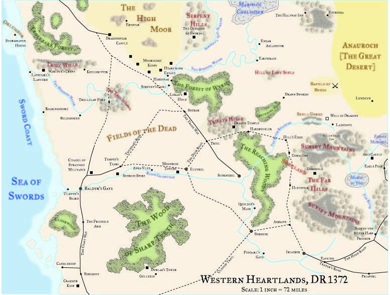 Map of the town of Steppenhall by Patrick Murphy (site of the party's covenant...er, base of operations) Map of the Kingdom of Damara by Patrick Murphy Map of the Western Heartlands by Patrick Murphy Map of the North (clickable to zoom in) from The North Big map of the Western Heartlands and North from the Forgotten Realms Campaign Setting book (numbered locations trace the adventurers' travels) |